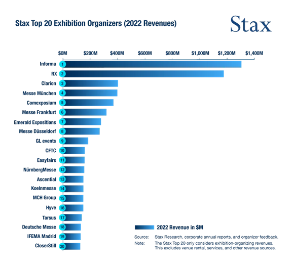 在展览行业,了解顶尖组展机构基于营收的排名对于把握行业趋势和市场动态至关重要。Stax公司发布的年度“Top20ExhibitionOrganizersbyRevenue”报告为行业提供了一个简单直白的视角,通过分析2022年和2023年的数据,我们可以观察到行业领导者的排名变化以及市场恢复的情况。