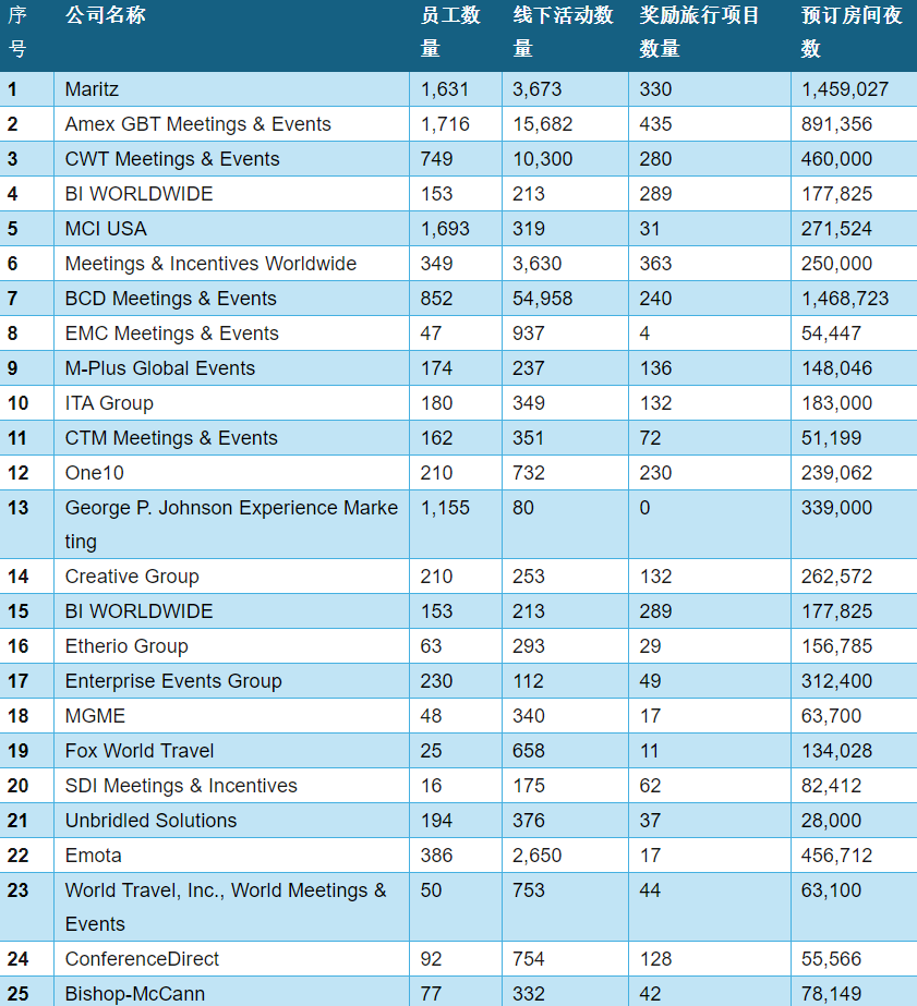 9月21日,英富曼connect旗下专业会奖媒体MeetingsNet发布了CMI25榜单(全美最大的独立第三方商旅会奖公司)。这一榜单是基于这些公司2023年度的企业会议和奖励旅游活动的执行数量、相关房间夜数、员工规模以及其他关键因素进行综合评估的结果。