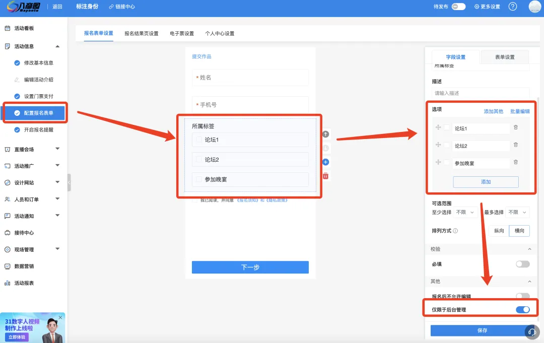 31会议提供灵活解决方案,支持为参会者标注多个身份标签,便于分类管理。通过简单操作,可轻松配置报名表单并设置多选字段。此外,31会议还提供活动推广、问卷调查等多样化功能,助力活动管理更轻松高效。