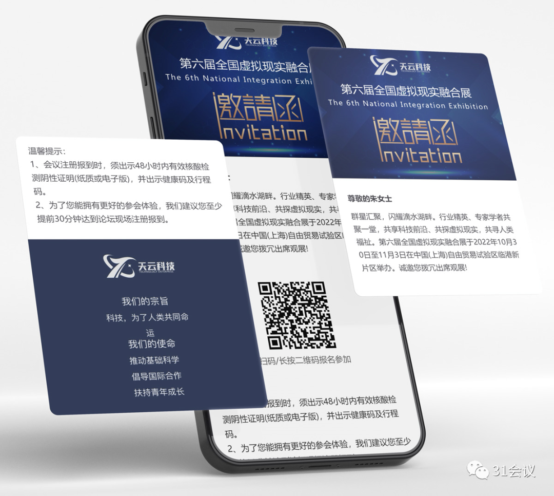 31大会易,一站式数字会务SaaS云平台,通过覆盖会前、会中、会后,贯通线上线下,结合硬件软件的一站式会议科技产品与服务,实现智慧邀约、智慧日程、智慧通知、智慧证件、智慧签到、智慧现场、智慧监控、智慧数据的会议全流程智慧化管理。