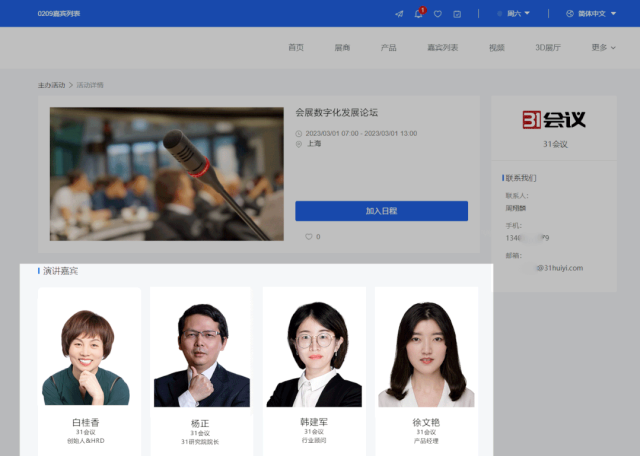 展览主办方通常会举办一些活动,丰富展会内容,提升展会质量,同时也为展会宣传一波。一般除了日程,影响观众报名活动意愿的还有发表主题演讲的嘉宾名单,观众会更乐于参加那些,他们感兴趣或喜欢的嘉宾做演讲的活动。所以本次31展览云迭代,将展览主办方日程与演讲嘉宾列表相关联,方便观众快速获取主办活动中的演讲嘉宾...