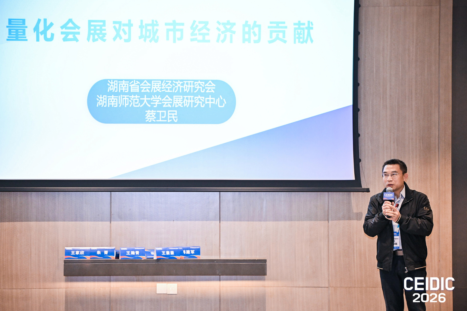 图:湖南师范大学会展研究中心主任蔡卫民做“量化会展对城市经济的贡献”主题演讲