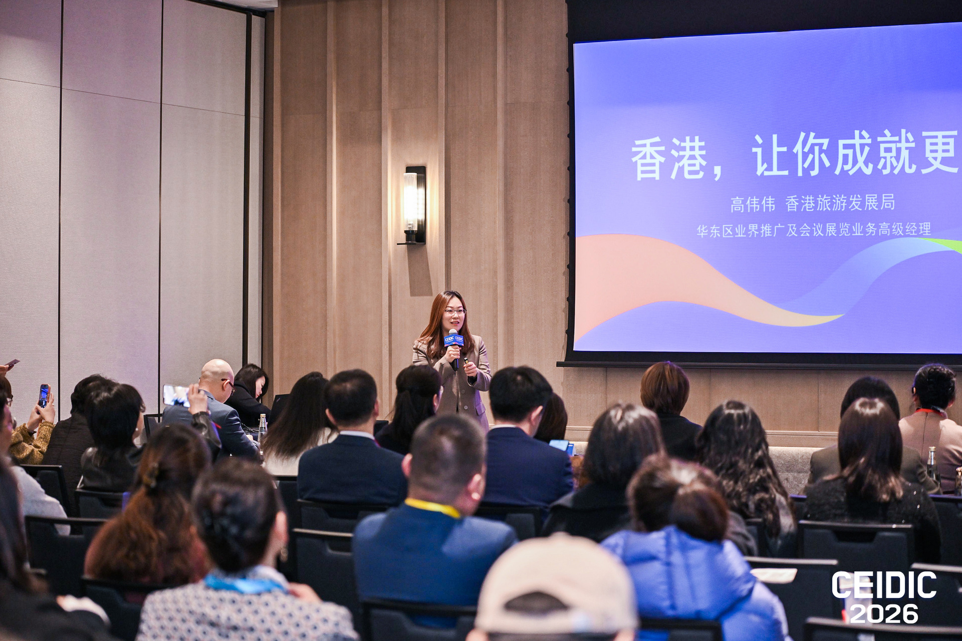 图:香港旅游发展局华东区业界推广及会议展览业务高级经理高伟伟做“香港,让你成就更多”主题演讲