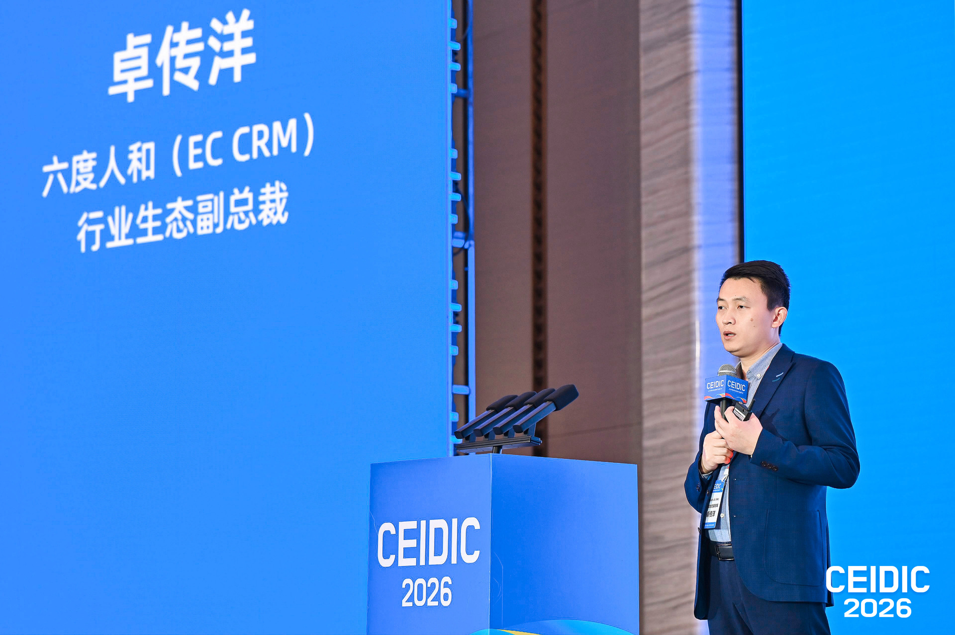 图:六度人和(EC CRM) 行业生态副总裁卓传洋做“会展智变・服务升级:AI话务助手助力会务服务新范式”主题演讲