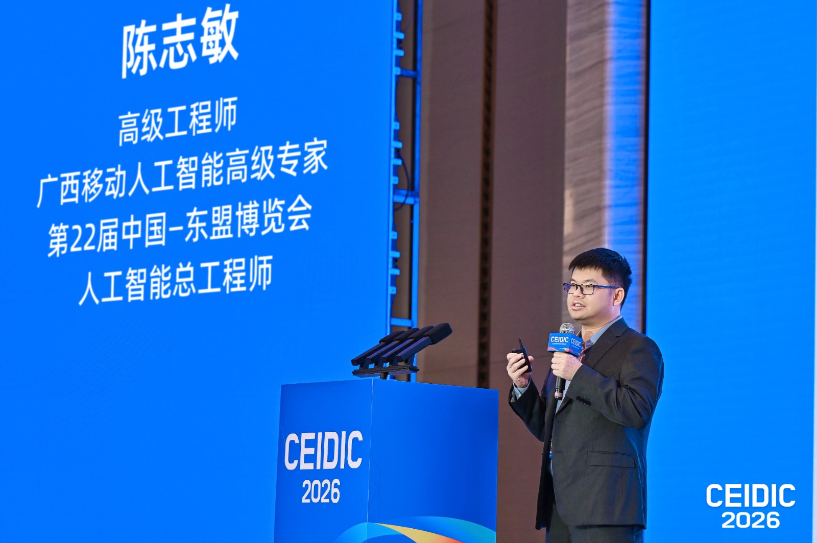 图:高级工程师、广西移动人工智能高级专家、第22届中国—东盟博览会人工智能总工程师陈志敏做“AI重塑会展:从‘场地经济’到‘智能生态’的战略突围”主题演讲