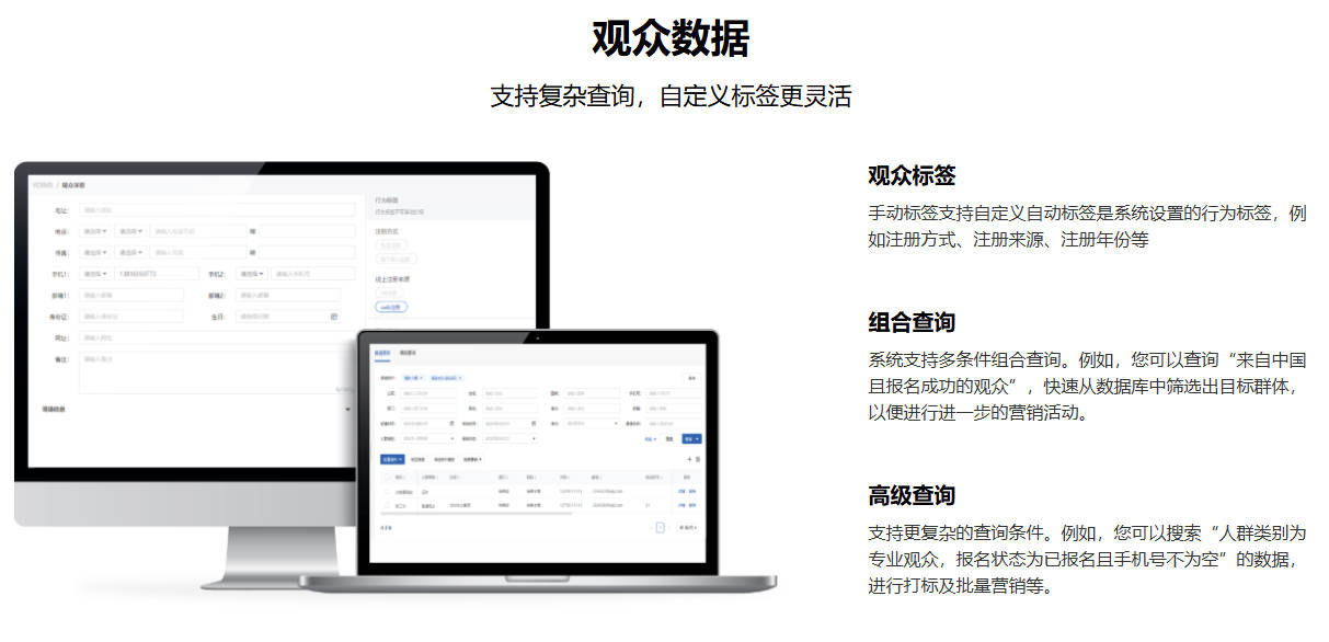复杂查询:支持多条件“与/或”逻辑组合,如“地区=中国”且“观众类型=专业观众”且“报名状态=已支付”。