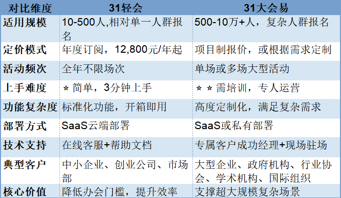 双产品战略:31轻会(中小型活动)+31大会易(大型复杂活动),满足所有企业需求