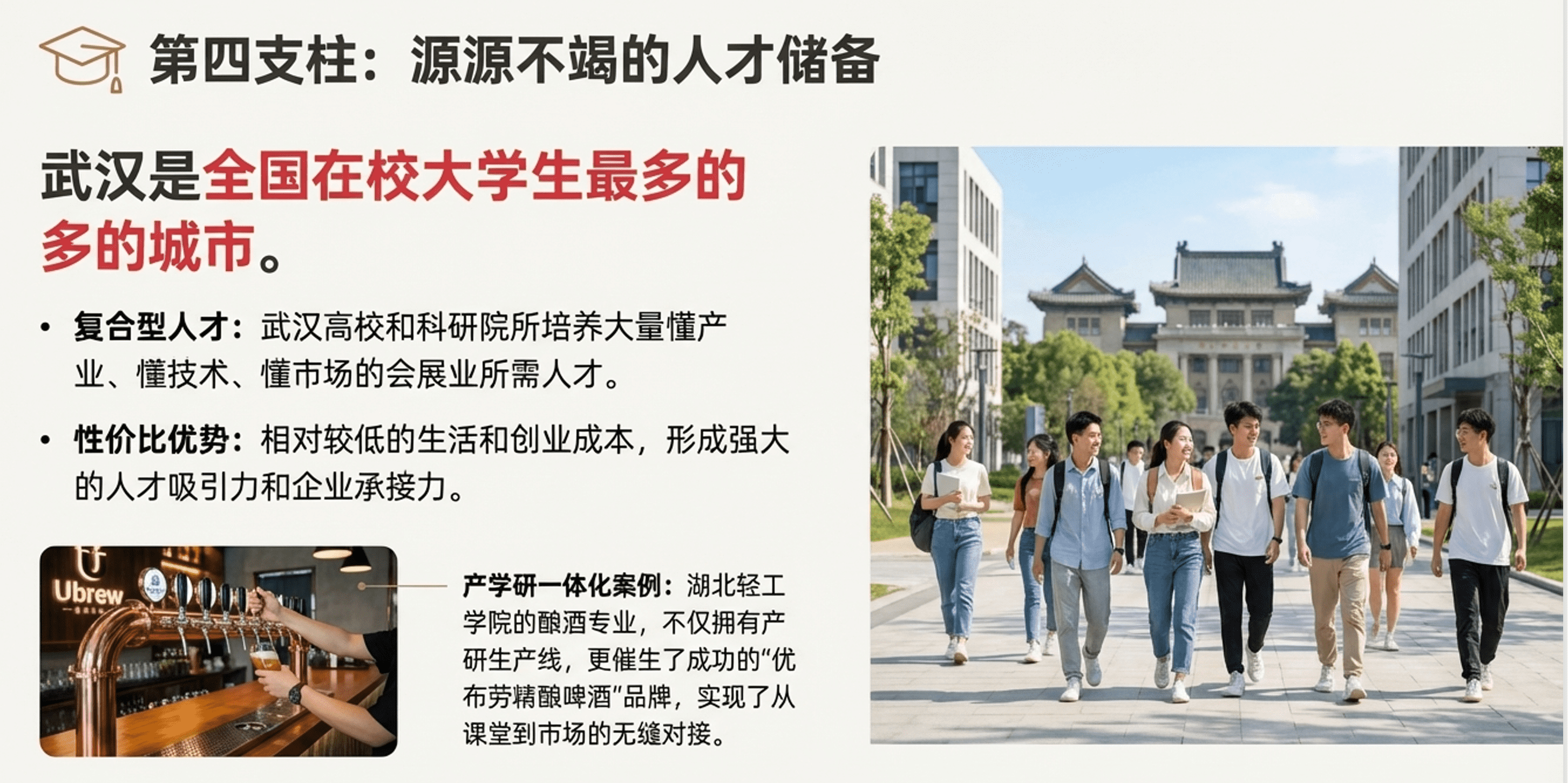 值得一提的是,武汉的职业技术教育也颇具特色。 比如, 据刘臻老师介绍,湖北轻工学院的酿酒专业就是一个很好的例子,不仅有自己的产研生产线, 其毕业生创业开设的优布劳精酿啤酒品牌,网点遍布光谷,辐射武昌 。这种产学研商一体化的人才培养模式,为会展业 所服务的 相关产业提供了扎实的技术和人才支撑。