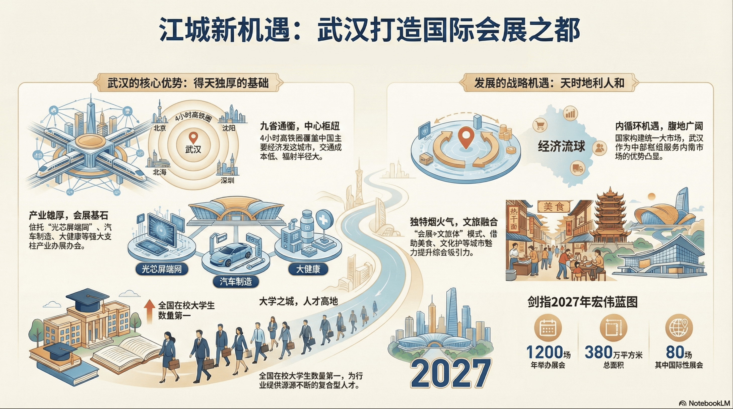 从上海到武汉,高 铁不过 四个小时。从北京到武汉, 从广州到武汉,都是朝发午至 。这种便捷性,对于会展业来说意味着什么?意味着更低的参展成本,更高的参会意愿,更大的辐射半径。当一个展会能够在四小时交通 圈内触达中国 最主要的经济区域时,它的市场潜力是巨大的。武汉 建设 天河 交通枢纽和会展 中心的建设,依托 天河空铁枢纽 ,正是要把这种区位优势转化为实实在在的会展经济优势。