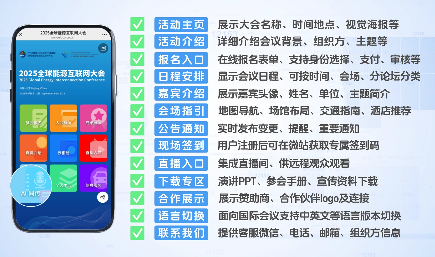 2. 功能零散:需要单独对接报名、签到、议程展示等多个模块,操作繁琐,数据难以统一管理,增加主办方工作量。