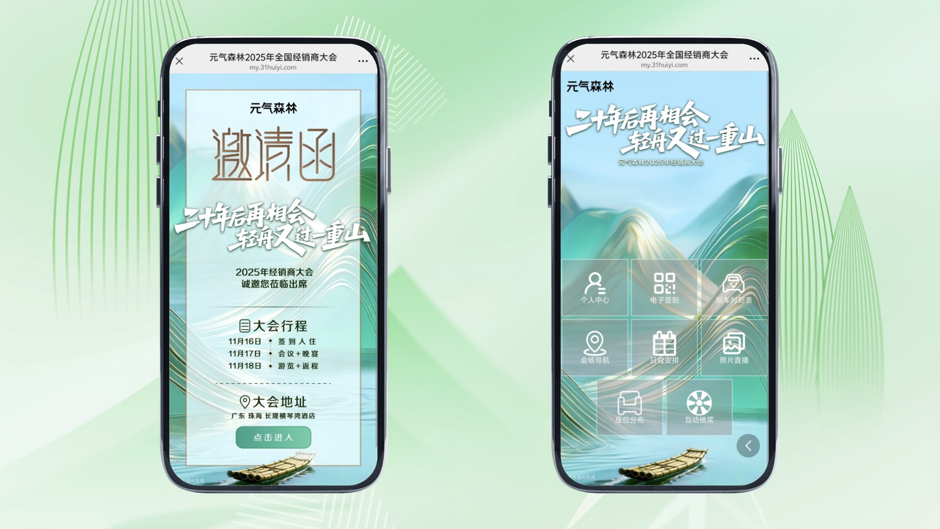 31会议服务:提供了集成会议信息查询、电子票二维码展示、会场导航、接送安排与班车时刻表查询、日程安排查看、照片直播观看、会场座位分布查询及互动抽奖等功能的会议微站,参会者一站式获取年会信息。