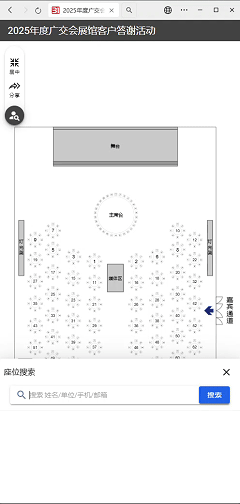 微站内置座位查询功能,参会者输入姓名或手机号即可快速定位个人座位区域及具体位置,有效避免了会场内寻找座位的混乱场景,保障了会议环节有序推进,让现场组织更高效。