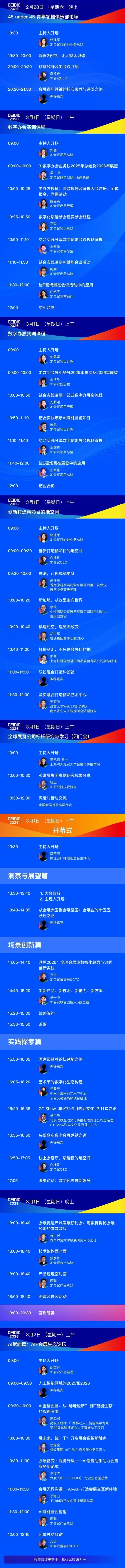 每一项议程,都紧扣会展数智化转型的核心需求,只为给行业带来可落地、可复用的实战方法与优质资源。3月1日-2日上海虹桥机场香格里拉酒店,行业大咖、精英同行已就位,扫码锁定席位,赴一场会展数智化的创新之约,共探行业新未来!