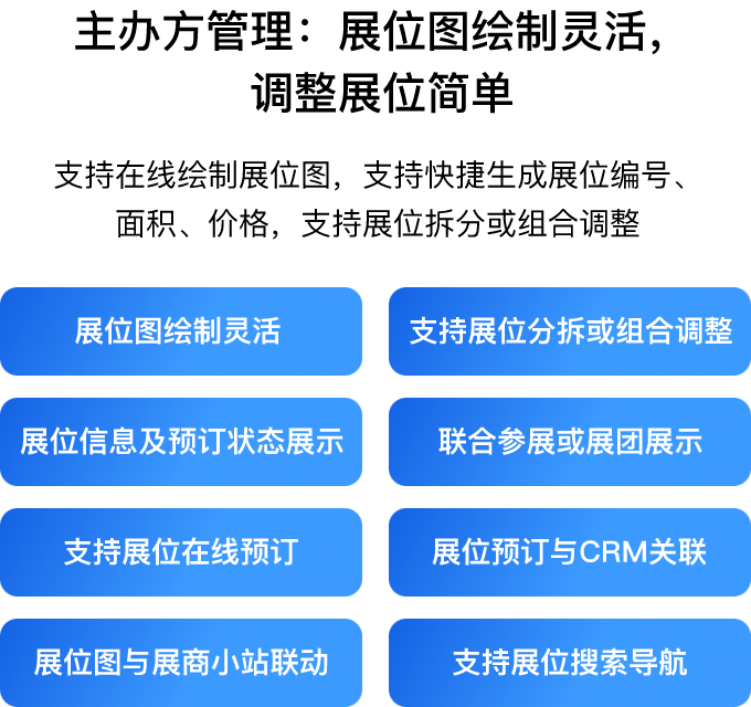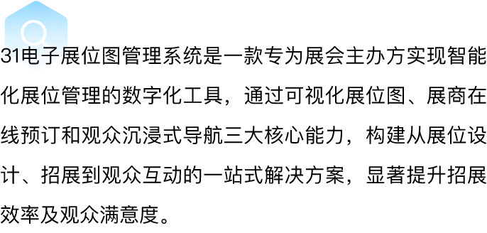 31电子展位图管理系统是一款专为展会主办方实现智能化展位管理的数字化工具,通过可视化展位图、展商在线预订和观众沉浸式导航三大核心能力,构建从展位设计、招展到观众互动的一站式解决方案,显著提升招展效率及观众满意度。