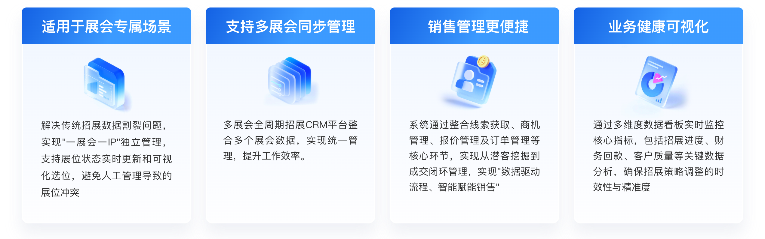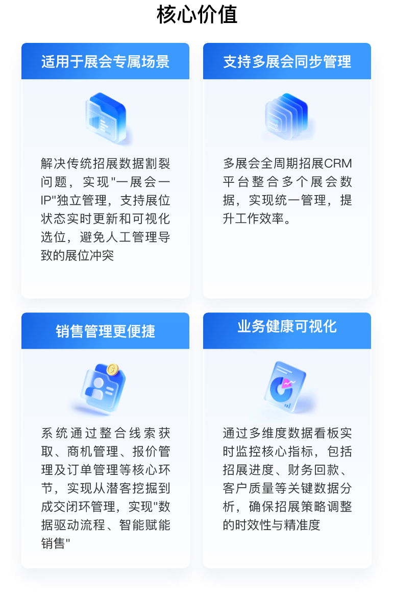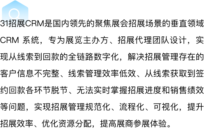 31招展CRM是国内领先的聚焦展会招展场景的垂直领域 CRM 系统,专为展览主办方、招展代理团队设计,实现从线索到回款的全链路数字化,解决招展管理存在的客户信息不完整、线索管理效率低效、从线索获取到签约回款各环节脱节、无法实时掌握招展进度和销售绩效等问题,实现招展管理规范化、流程化、可视化,提升招展效率、优化资源分配,提高展商参展体验。